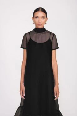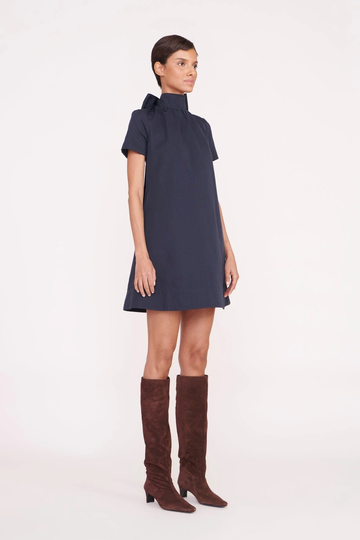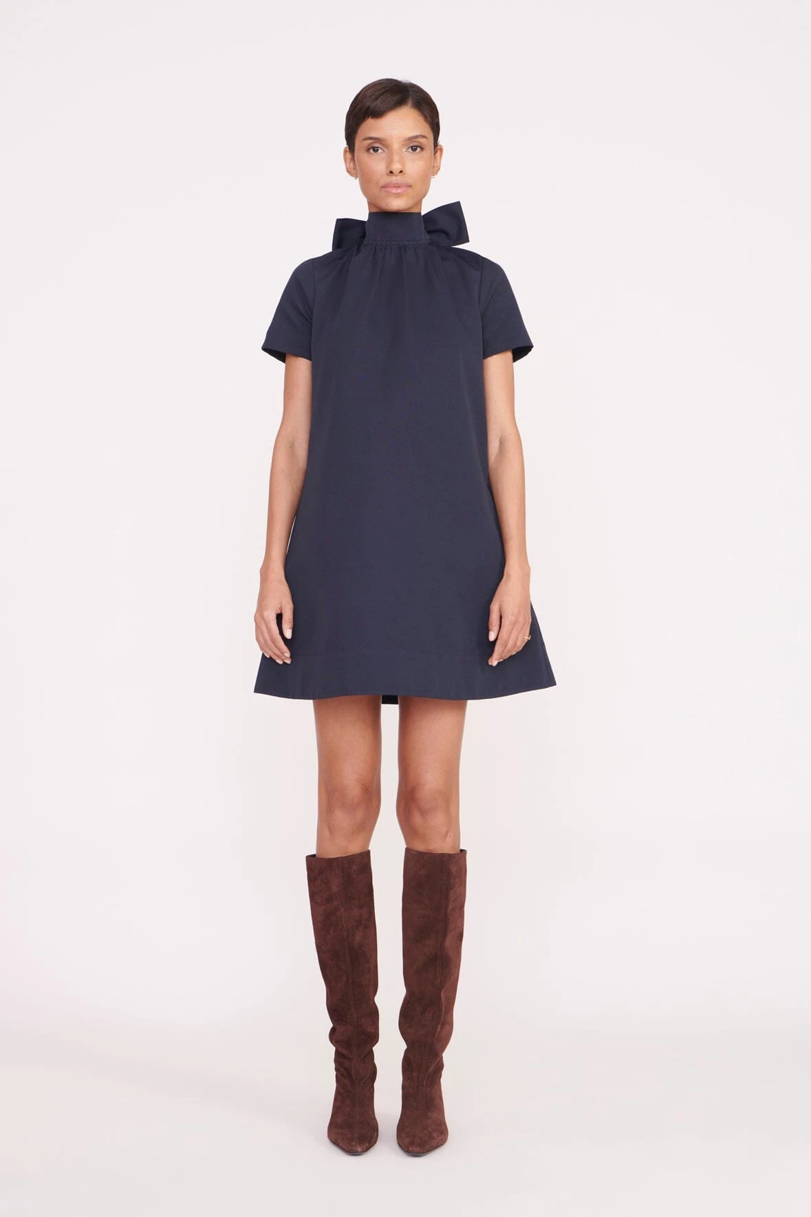 The Mini Ilana is a high neck mini dress with a scoop back and functional, self-tie bow collar. Constructed out of grosgrain fabric, this dress is the perfect statement piece for any occasion.