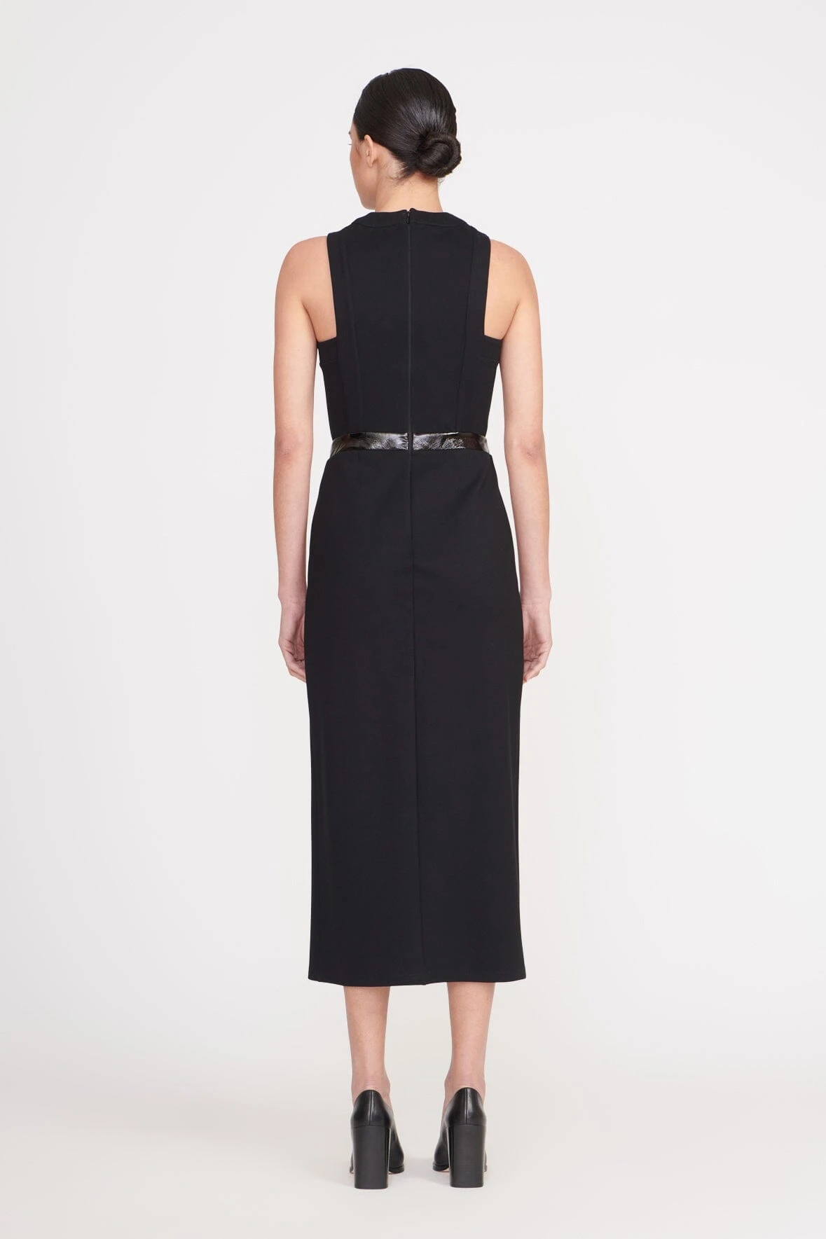 A fitted sleeveless dress crafted from a flattering ponte kint fabric. The Sharmila Dress features a thigh-high slit and patent leather belt detail at the waist.
